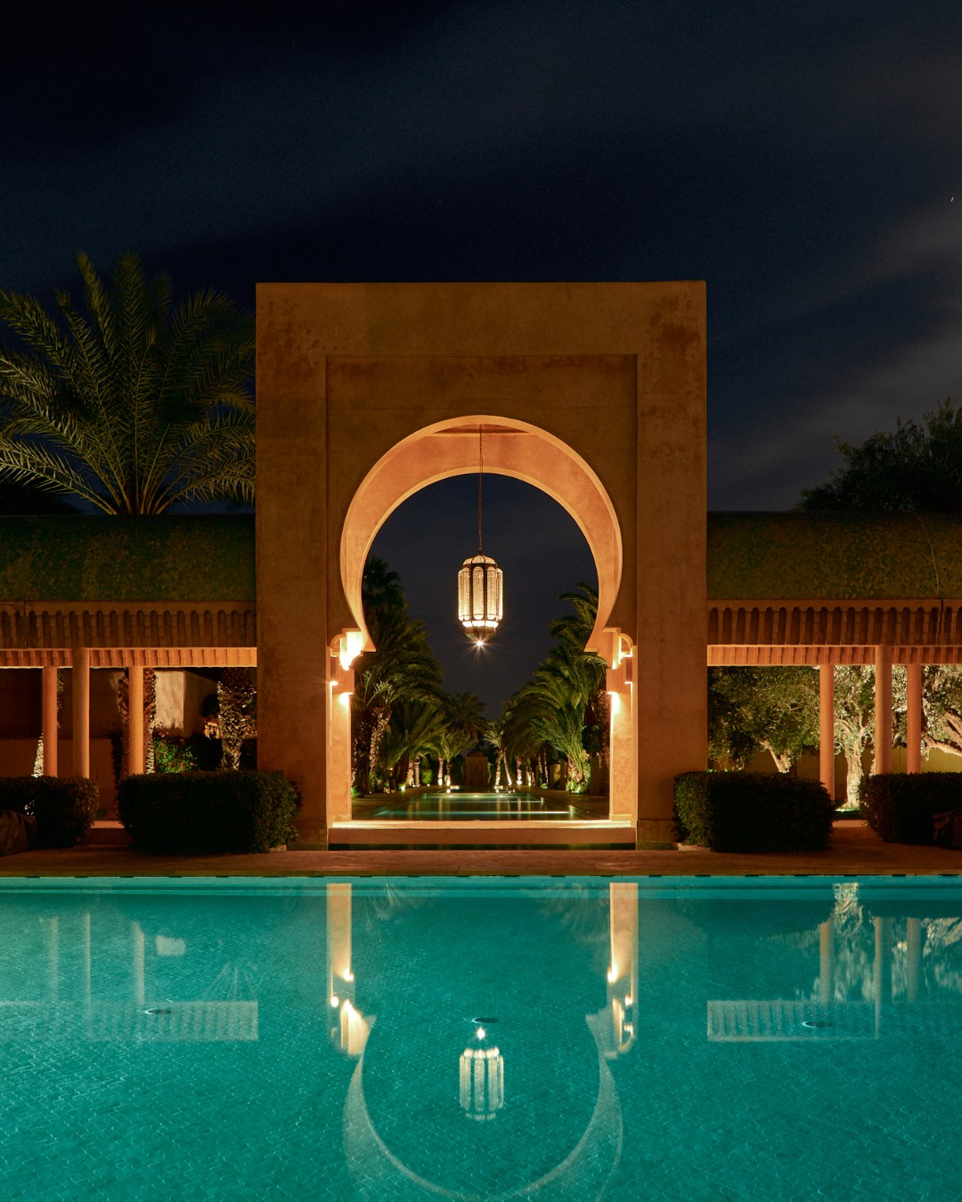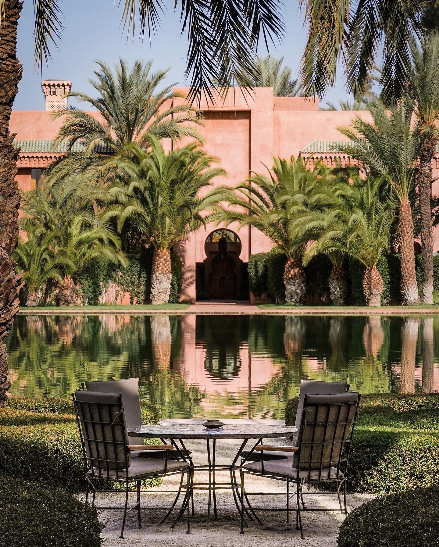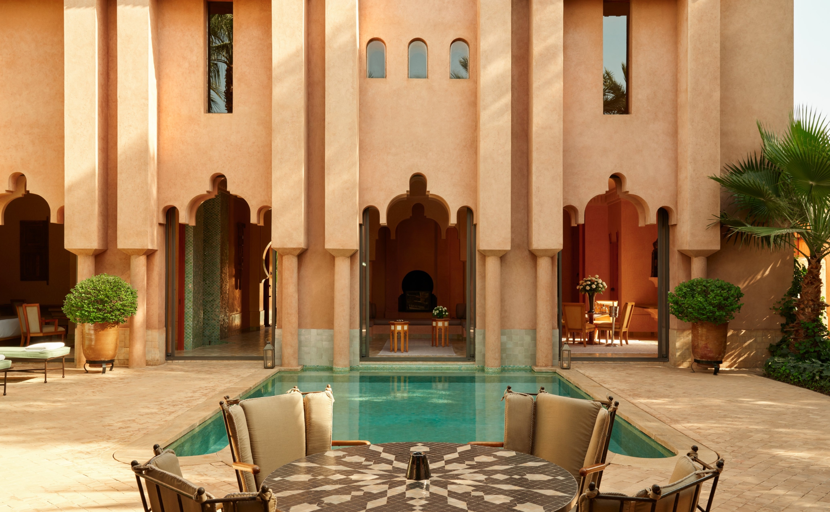 Inspired by the rose-hued buildings of old Marrakech, palatial Amanjena is close to the fabled Red City, set in its own expanse of gardens and grand open spaces. Shaded courtyards with fountains lead to the central basin, bordered by spacious standalone Pavilions & Maisons, many with private pools. Views stretch across the olive groves and palms of the oasis, extending to the High Atlas Mountains on the horizon.