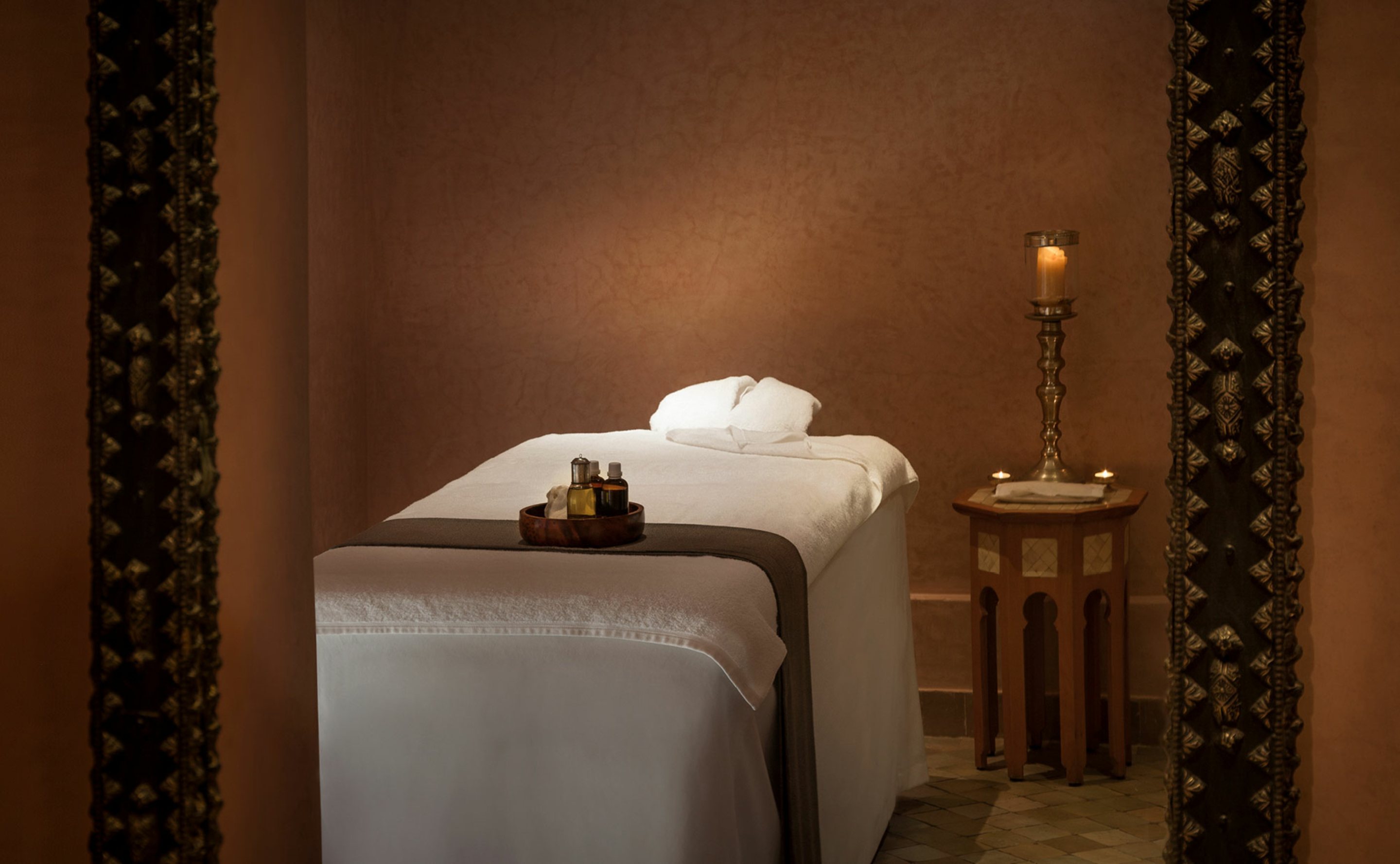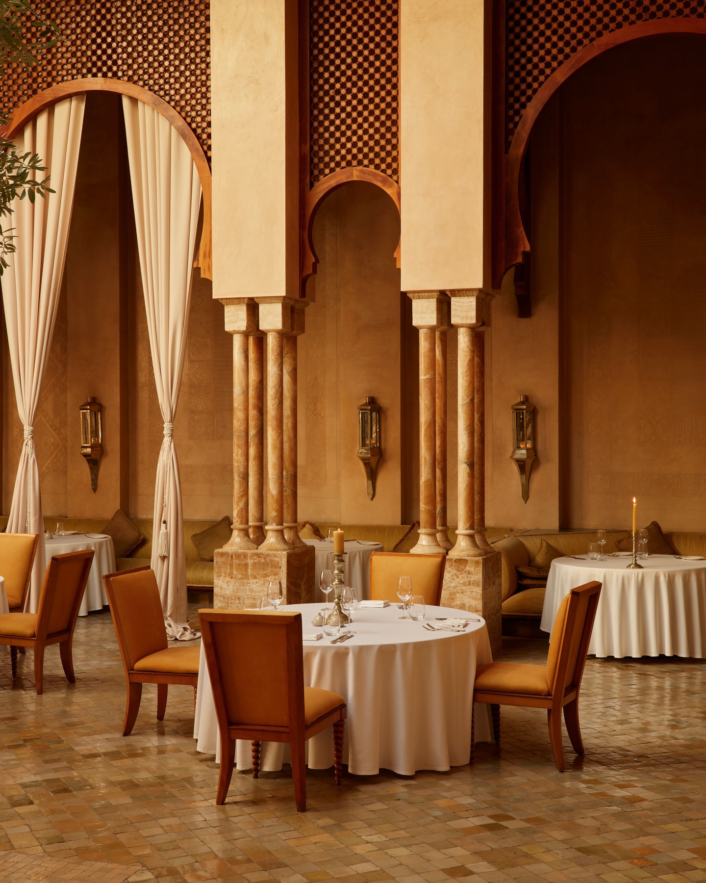 At the heart of earthen-walled Amanjena lies a courtyard restaurant that celebrates the diversity of Moroccan cuisine, blending Berber, Andalusian and Mediterranean influences that have evolved through the ages. With caramel-coloured walls and candle-lit tables, the Restaurant evokes the atmosphere of the Medina in an authentic homespun setting, enlivened by local musicians, who set the soundtrack to evening meals beside the central fountain. Â