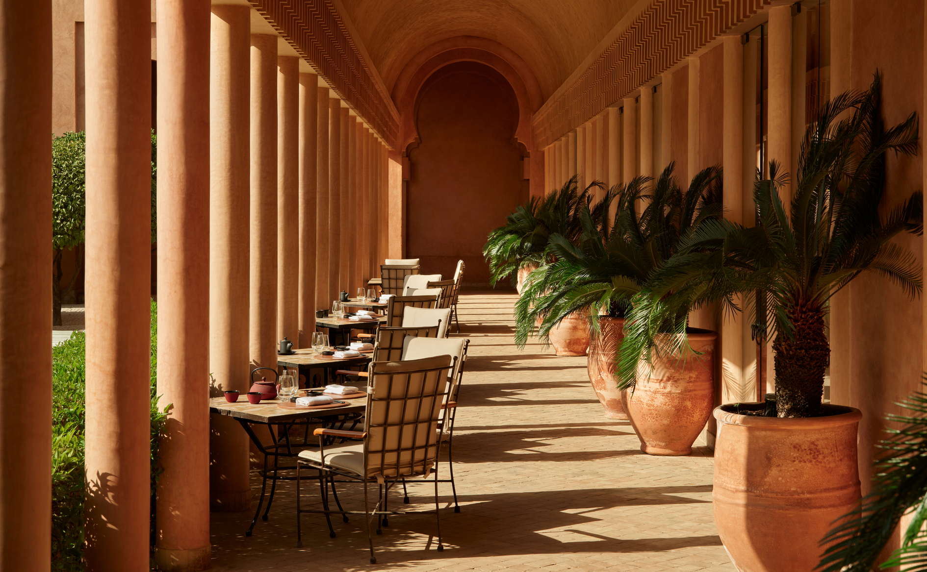 As the indolence of the afternoon washes over Amanjena, retreat to the shaded arches of the open-air Pool Terrace for a menu of cooling classics, including salads, snacks and sides, as well larger midday mains, including club sandwiches and burgers. House-made pizzas arrive from the wood-fired oven in the adjoining Olive Grove. As dusk bathes the rose-pink walls in a golden light, raise a glass to the day with a selection of cocktails, champagnes and wines.