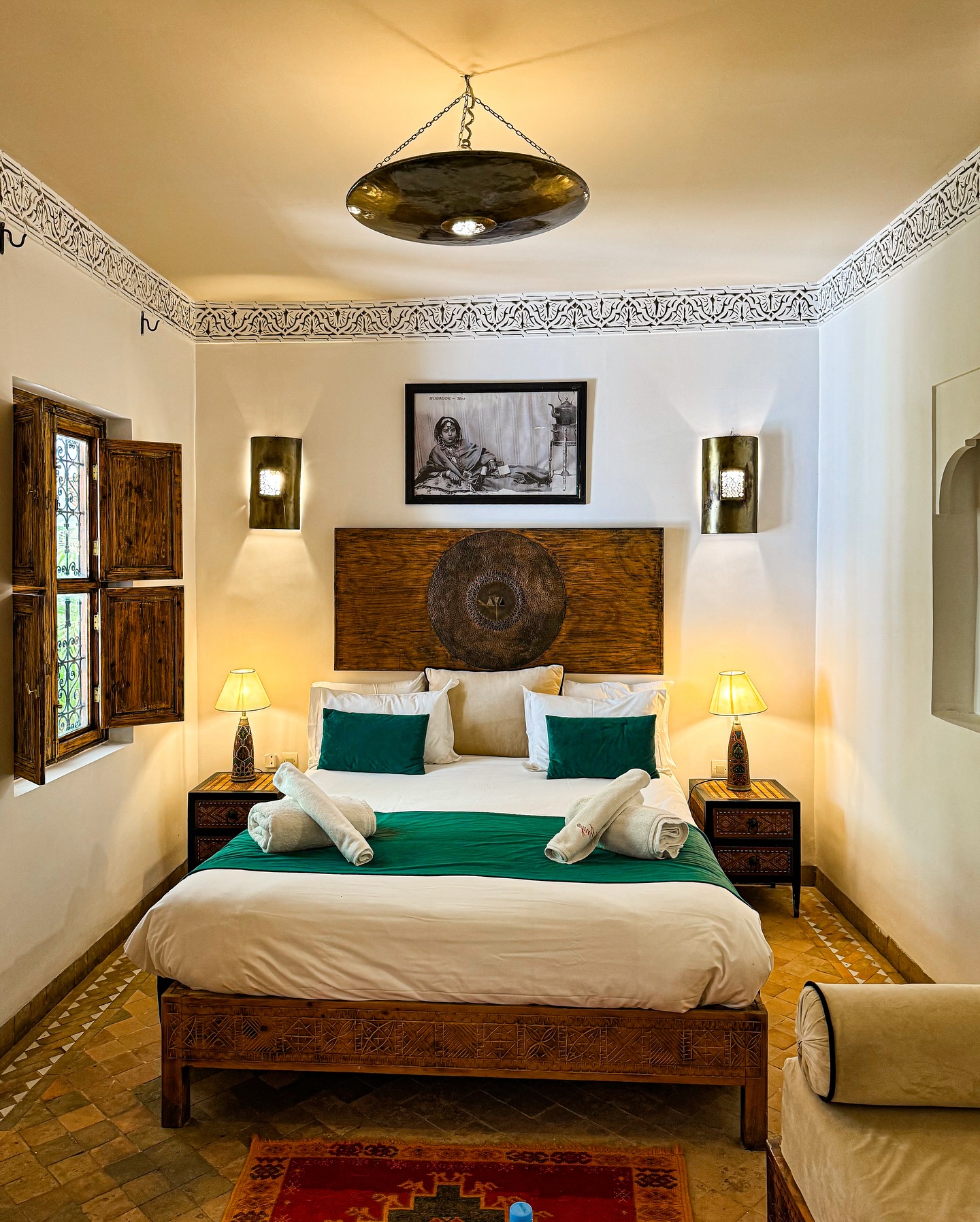 This beautiful room is on the ground floor and overlooks the patio. The decor features shades of turquoise, emerald, and indigo on the bedspread and accessories against an all-white backdrop, and a tadelakt bathroom in a warm, golden hue.