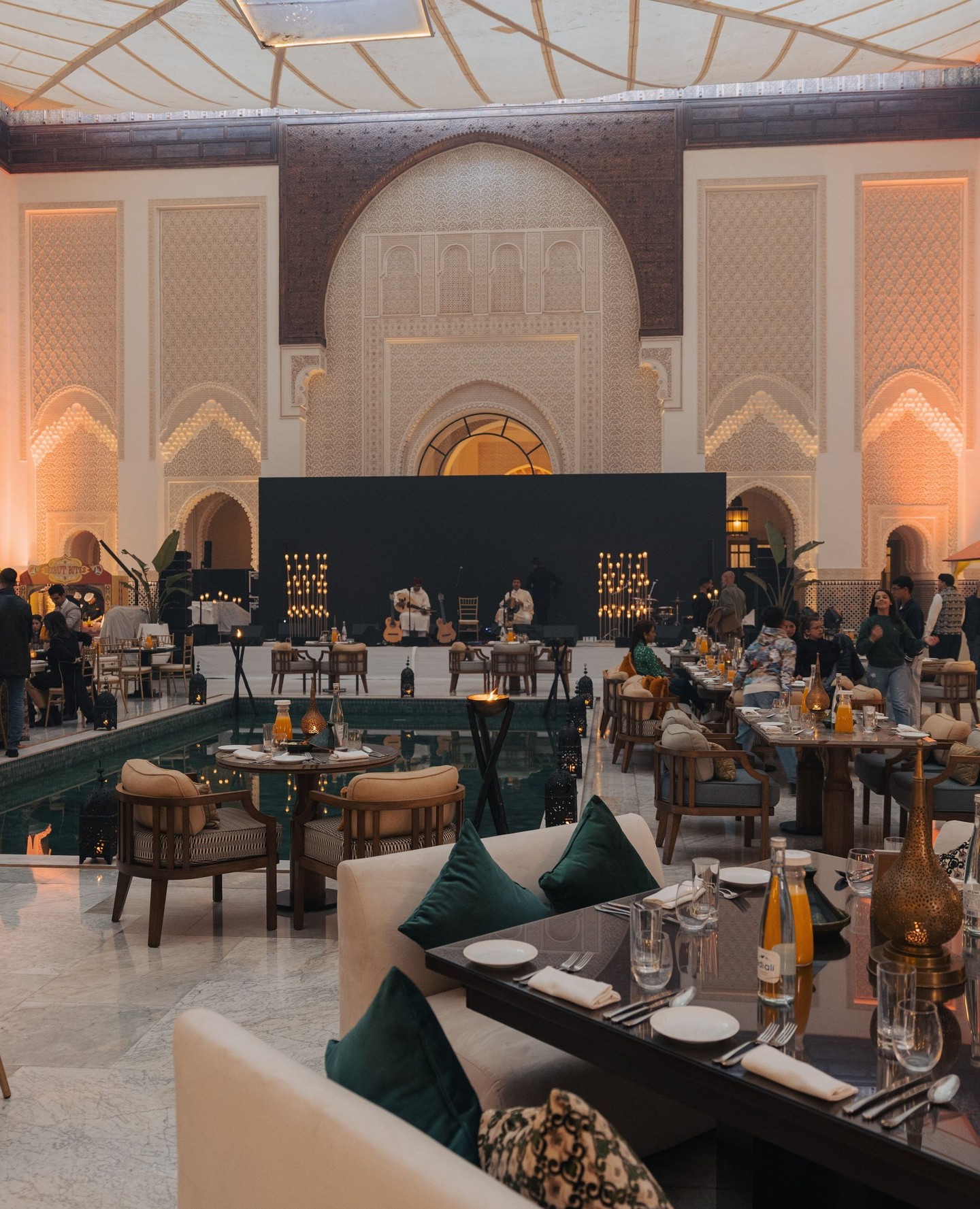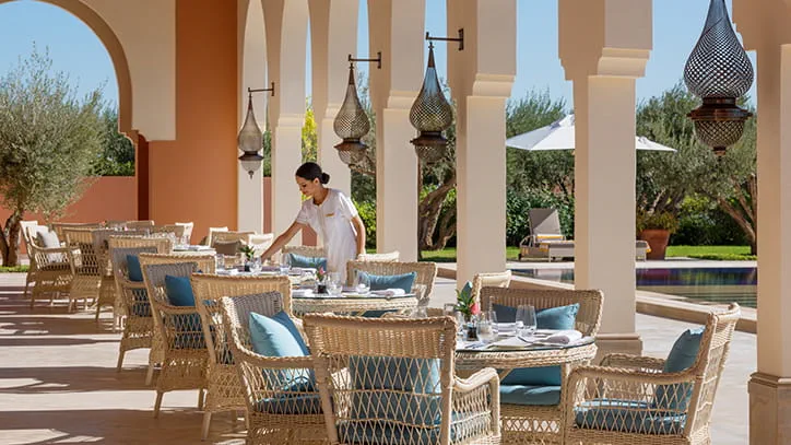 This ambient restaurant offers a specially curated menu of light and healthy meals throughout the day. Enjoy views of the beautiful pool, the Grand Canal water feature, citrus and olive gardens and the Atlas Mountain range.